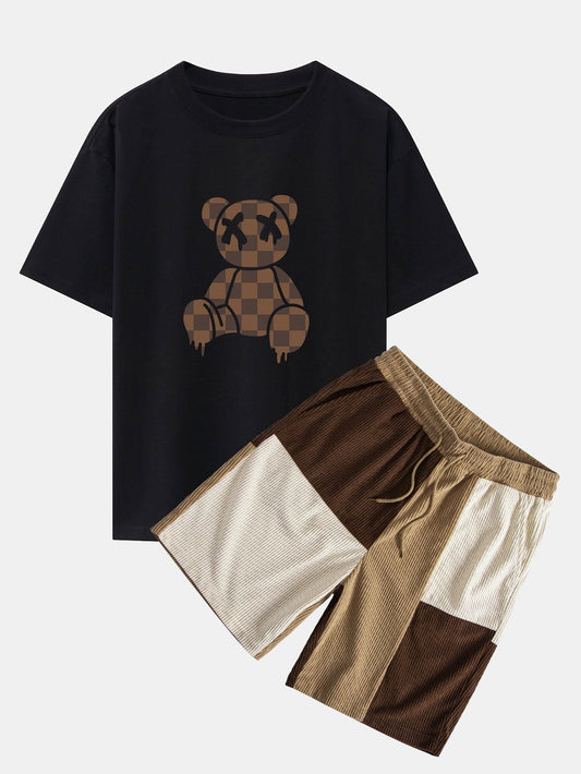 Checkerboard Dissolving Bear Drop Shoulder Oversize T-Shirt & Colorblock Corduroy Shorts